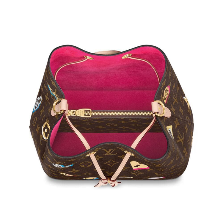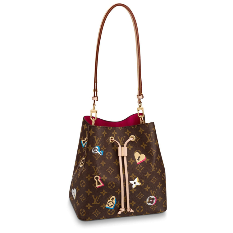 From the Spring 2019 capsule collection, this NeoNoebucket bag features a decor of locks, keys and blossoms: symbols of love as well as of Louis Vuitton’s travel heritage. The metallic motifs are fused to classic Monogram canvas, adding a “crafted” twist to this versatile model. Charming and collectible, it makes an ideal Valentine’s Day gift.