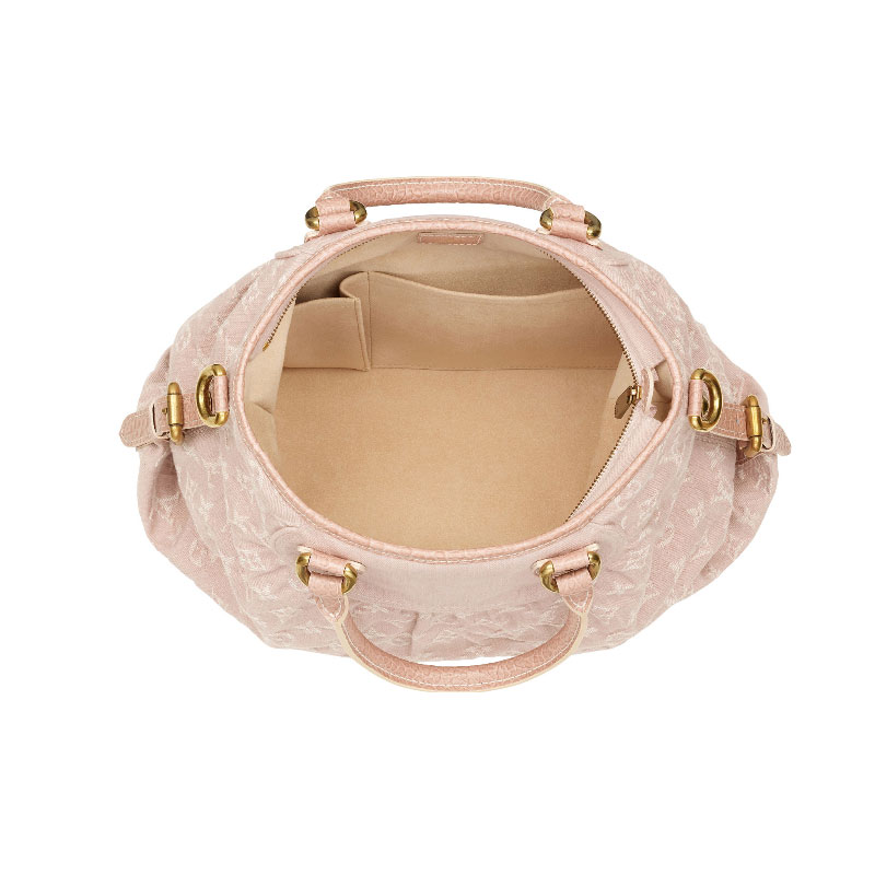 - Monogram Denim, natural cowhide trimmings in the blue denim version and grained black calf leather, in the black denim version, saffron microfiber lining