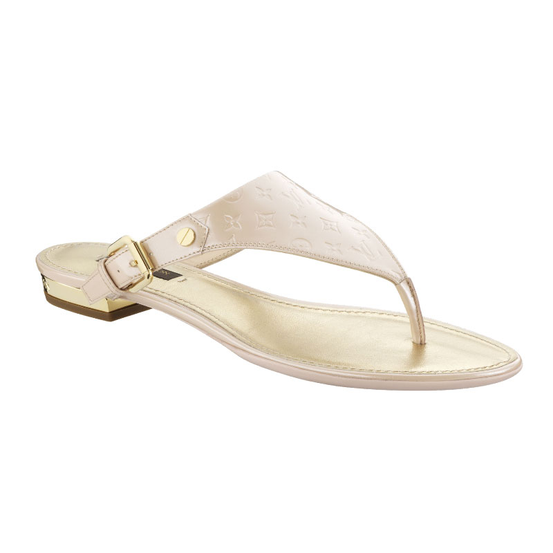 These casual chic thongs in the rich, glossy Colors of Louis Vuitton's cult Monogram Vernis coordinate perfectly with the leather goods line. They are signed with a golden plaque on the heel.