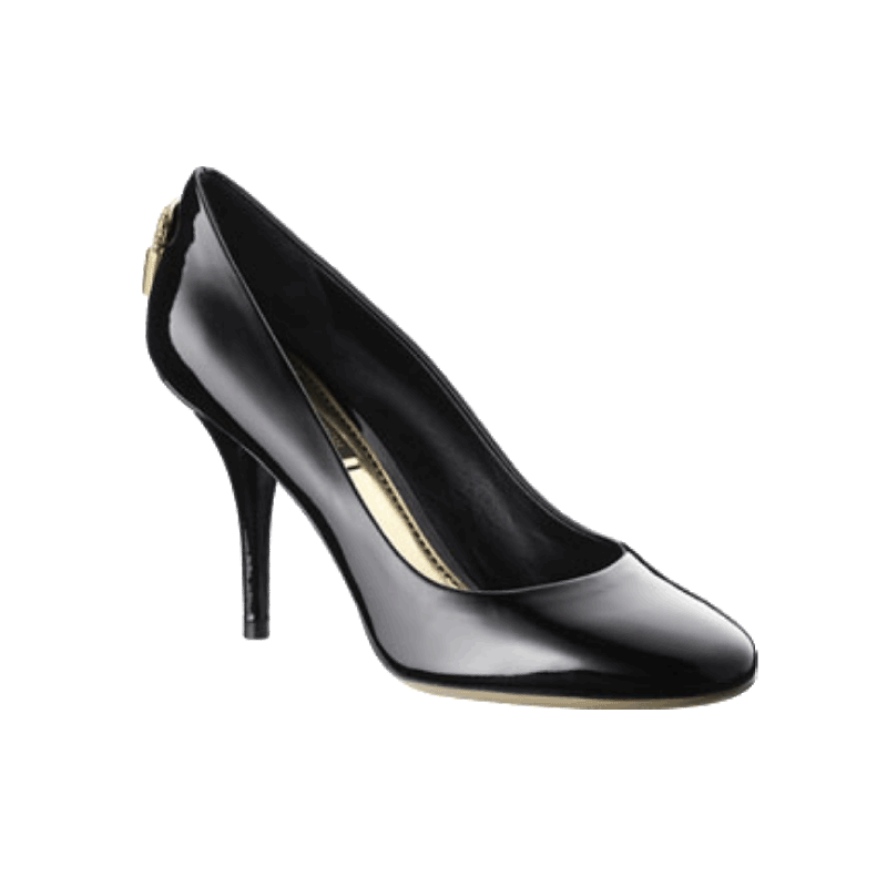 A comfortable round toe and deep decollete are distinctive features of these feminine high-heeled pumps, which are signed at the back with a golden Louis Vuitton padlock.