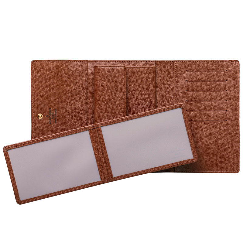 - Six credit card slots, snapped coin pocket, bill slot, two long interior compartments to hold papers