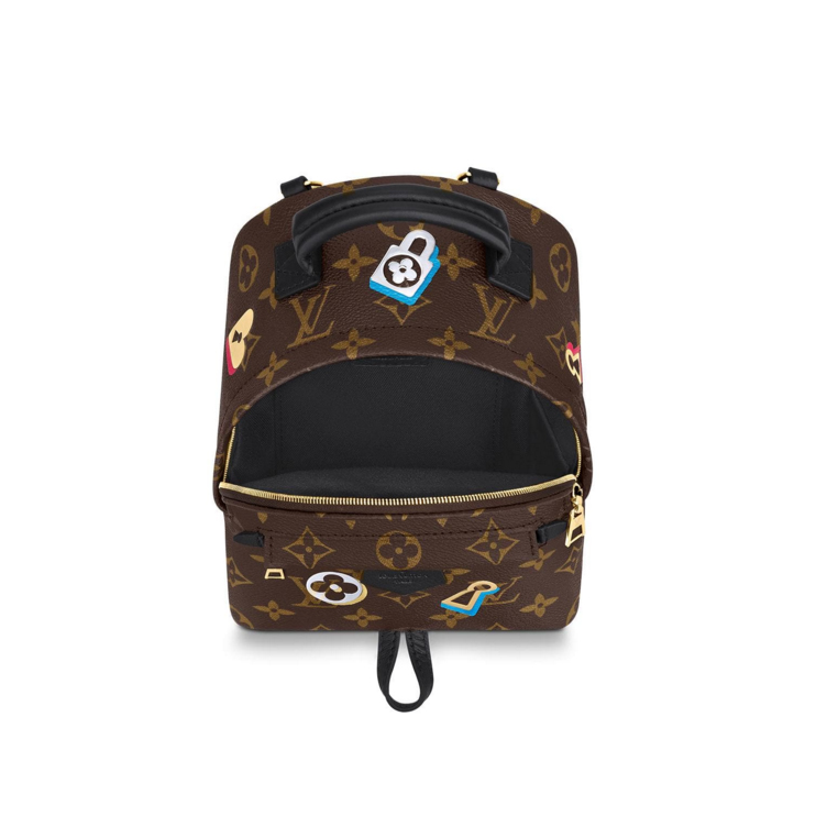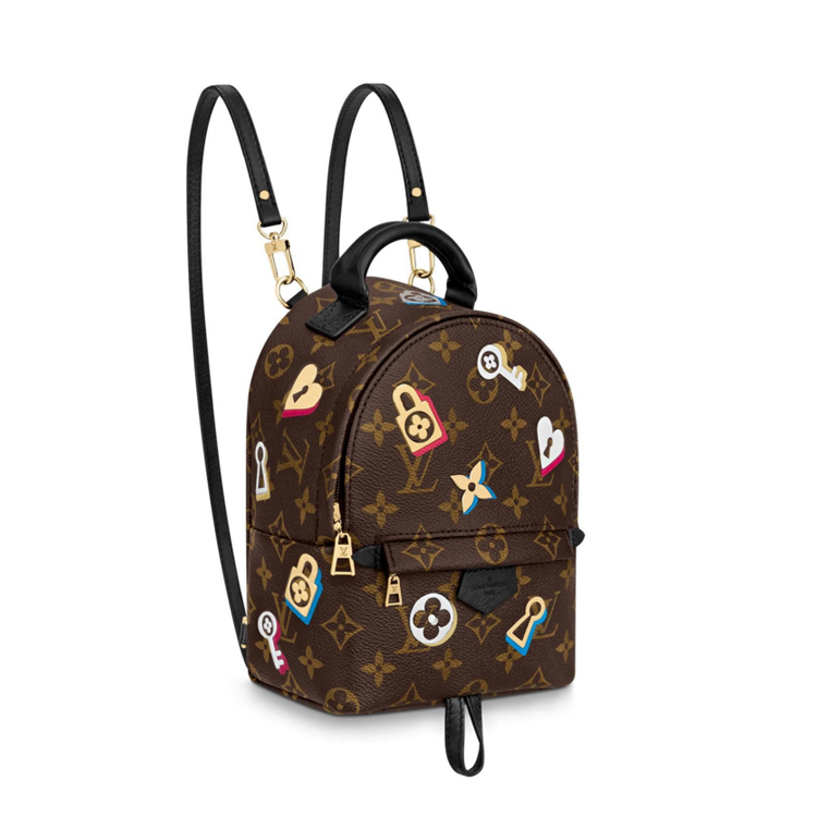 From the Love Lock capsule for Spring 2019, the Palm Springs backpack is adorned with lock, key and flower motifs: emblems of the House and symbols of lasting love. The colorful metallic designs are expertly fused onto Monogram canvas, for a surprising 3D effect. Charming and collectible, this mini model makes a romantic Valentine鈥檚 present.