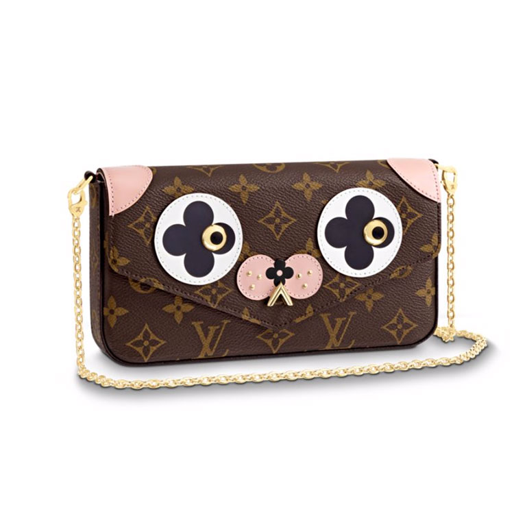 For Valentine's Day, an adorable dog incorporating iconic Louis Vuitton details adds a touch of fun to the Pochette Felicie in Monogram canvas. The stylish solution to carry and organize daily essentials, it features two removable interior pockets and can be transformed into a shoulder bag thanks to its removable golden chain.