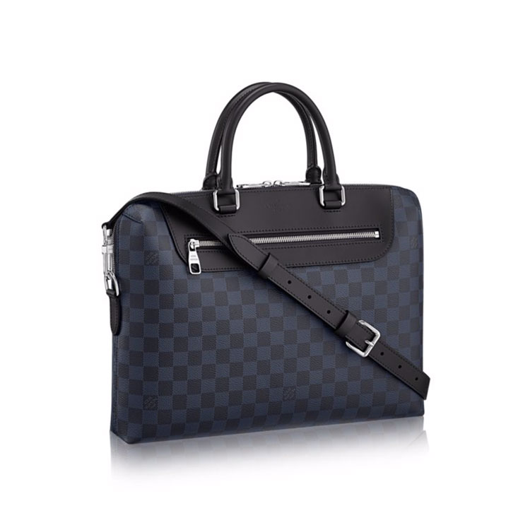 Richly embossed Damier Cobalt adorns the Porte-Documents Jour. For the city-dwelling man, this is a highly practical bag, with its multiple carry options, its very practical zippered pocket in the front and enough room to easily carry a 15" laptop.