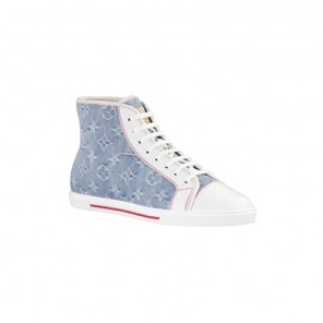 These sneakers combine the sun-bleached Monogram Denim first seen at Louis Vuitton's Spring/Summer 2010 fashion show with fluorescent pink stitching for a colorful vintage look.