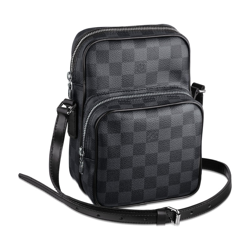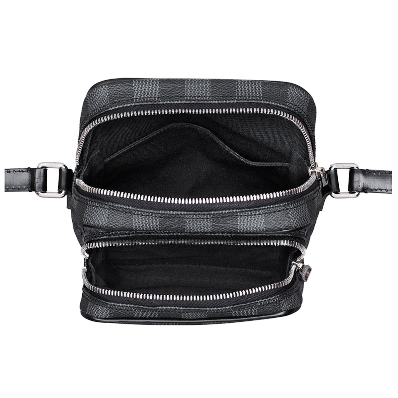Rem, a compact and sharply styled city bag in Damier Graphite canvas is lightweight, robust and functional with an outside zipped compartment.