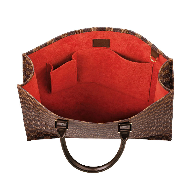 - Damier canvas, chocolate smooth leather handles, terracotta microfiber lining