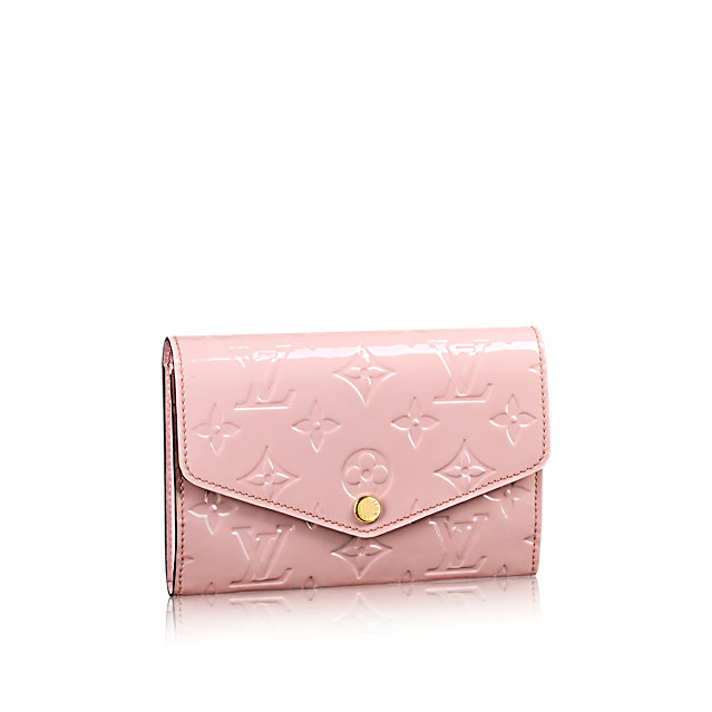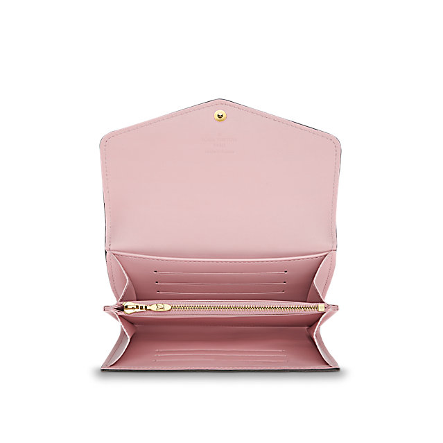 The stylish Sarah Compact Wallet in Monogram Vernis boasts all the functionalities of a long wallet in a compact size that fits easily into a small bag or clutch. The iconic envelope shape contains an ingeniously designed interior with a variety of pockets and credit card slots.