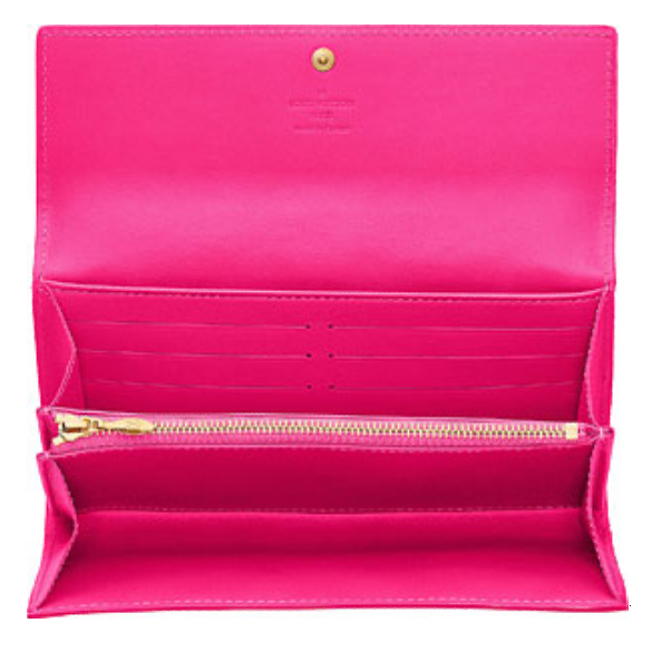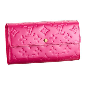 This wallet fashioned in discreetly embossed Monogram Vernis leather is feminine and compact. It features a press stud closure and is designed to hold bills and credit cards.