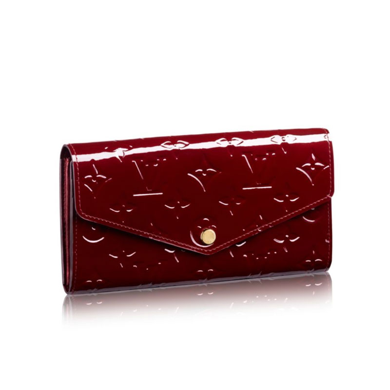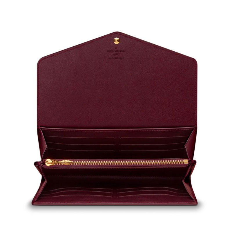 This envelope-style Sarah wallet combines an exterior in discreetly embossed Monogram Vernis leather with an ingeniously designed interior featuring a variety of pockets and credit card slots.