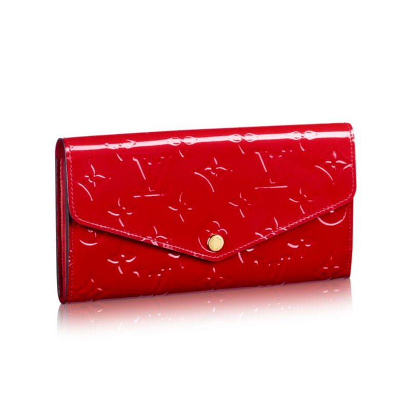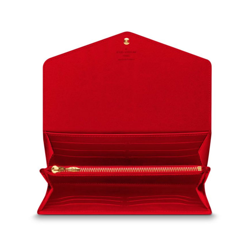 This envelope-style Sarah wallet combines an exterior in discreetly embossed Monogram Vernis leather with an ingeniously designed interior featuring a variety of pockets and credit card slots.