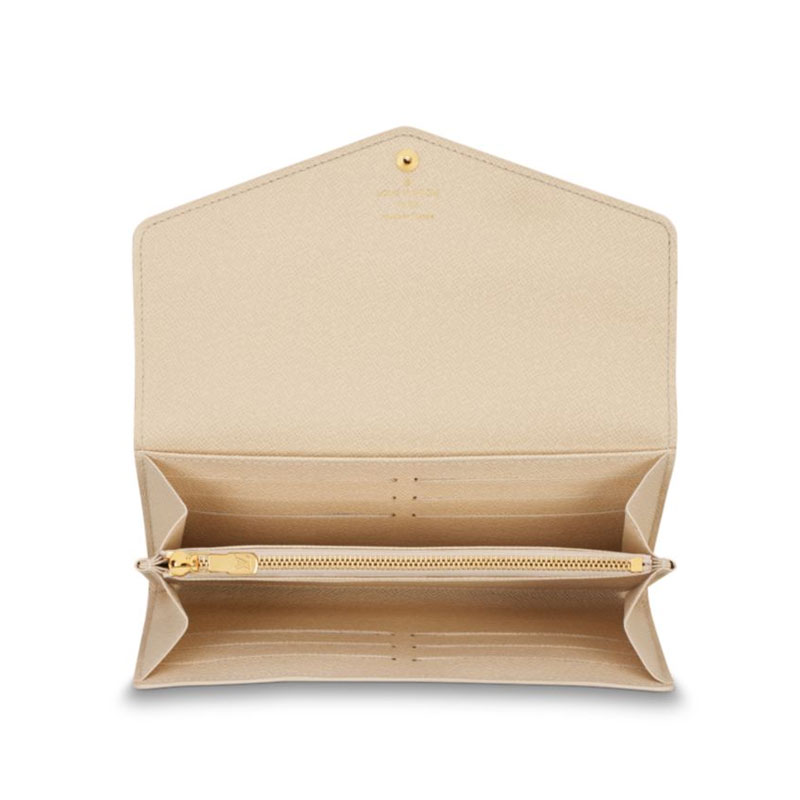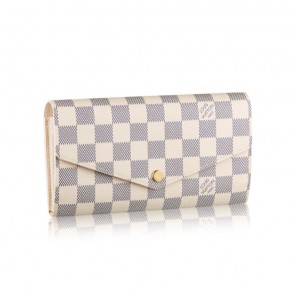 This envelope-style Sarah wallet combines an elegant exterior in Damier Azur canvas with an ingeniously designed interior featuring a variety of pockets and credit card slots.
