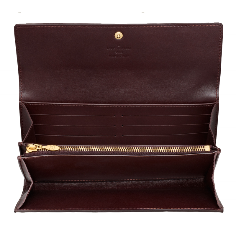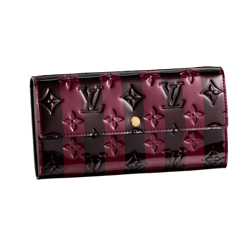 With eye-ctching vintage-inspired stripcs and in chic monogram vernis rayucs,the sarah wallet is the epitome of feminine glamour. numerous pockets and compartments add to its tefined appeal.