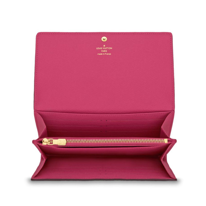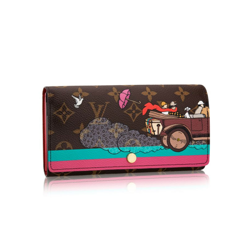 Ideal gift, this witty and colorful limited edition, inspired by an historical advertisement from 1921, pays tribute to Louis Vuitton's travel heritage. The Sarah Evasion Wallet in Monogram adorns the classic Sarah wallet whose ingenious design features a variety of pockets and credit card slots.