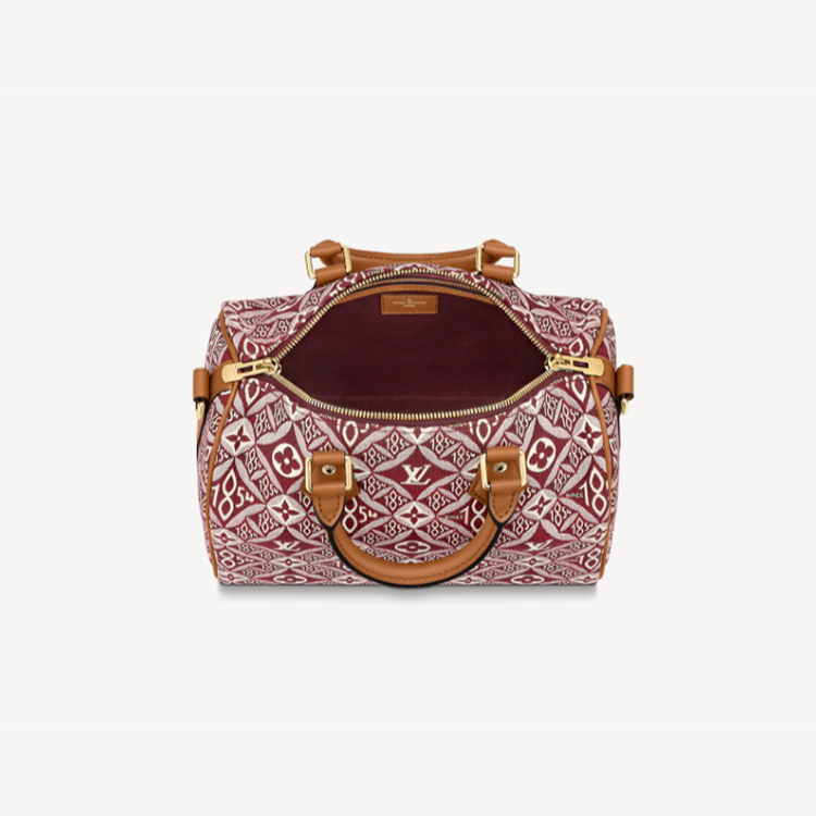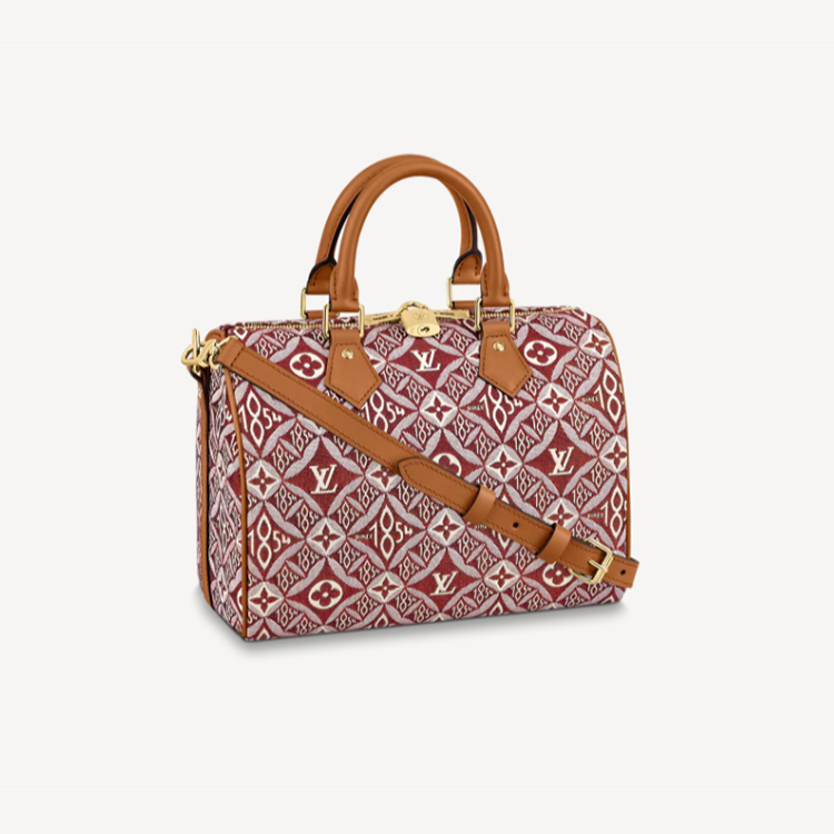The classic Speedy Bandouliere 25 handbag looks striking in Jacquard Since 1854 textile with gold-color hardware and black leather trim. The new woven pattern, introduced by Nicolas Ghesqui猫re for the Fall-Winter 2020 Collection, combines Monogram Blossoms with other House symbols and the number 1854, the year of Louis Vuitton started his business.