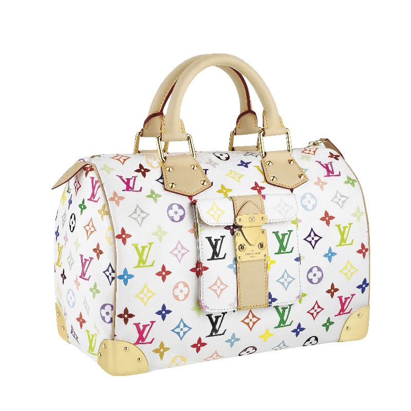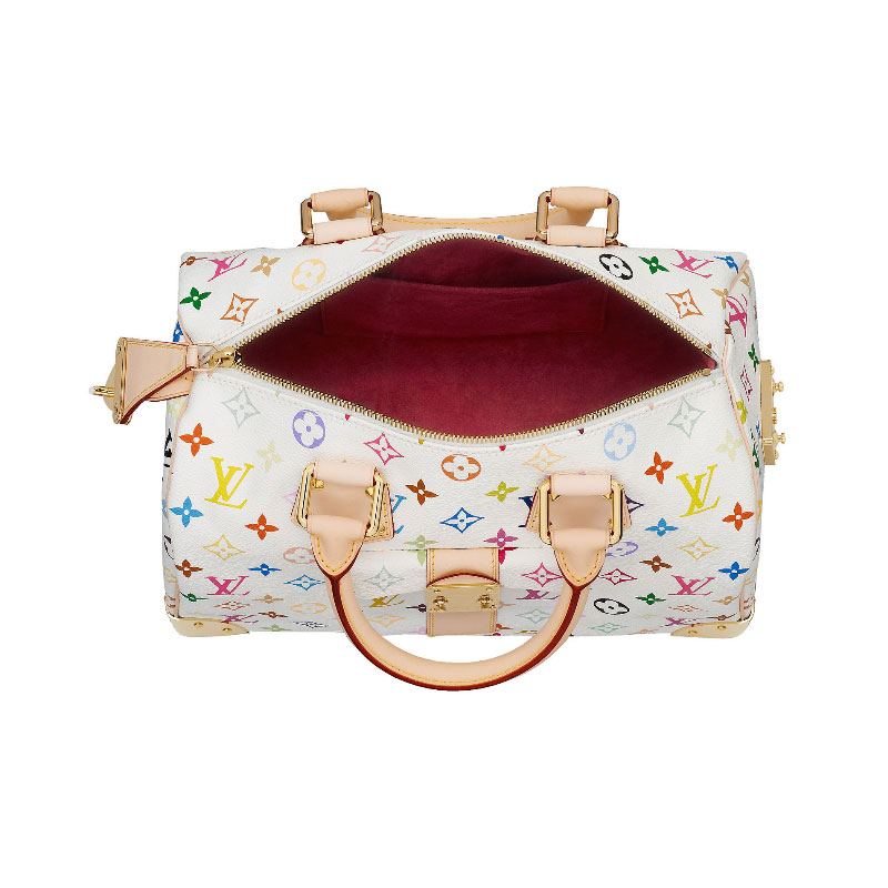 Speedy 30 gets a modern look with the Monogram Multicolore canvas designed by Takashi Murakami. Its base is protected by four golden brass corners and its outside pocket clicks shut with an S-lock.