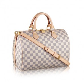 Every feature of this Speedy is iconic: the unique shape, the leather handles, the Damier Azur canvas. No wonder it has achieved cult status the world over. Designed for travelers in 1930 (the name is a nod to the era's rapid transit), with a strap for casual cross-body wear, today’s Speedy 30 is a perfect city bag – supple, lightweight and forever in style.