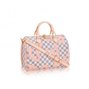 The iconic Speedy bag is given a fresh, feminine feel for summer in Damier Azur canvas overlaid with a surprising Monogram print adapted from the Louis Vuitton archives.