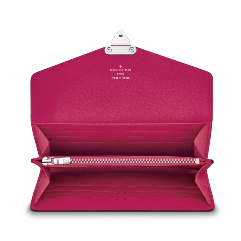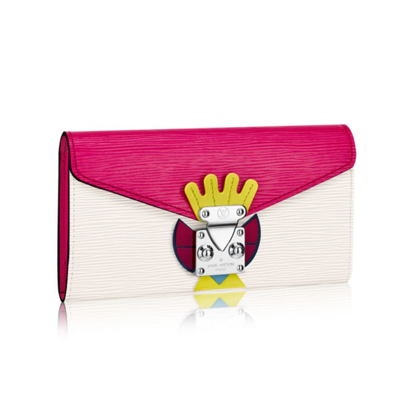 This envelope-style Sarah Wallet in iconic Epi boasts a unique Tribal Mask design for its closure. The ingenuous interior features a variety of pockets and credit card slots.