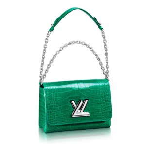 This chic little crocodile bag has a secret: it's roomier than it looks. The cleverly designed "wave" base provides extra space for storing necessities. Rendered with a 3D bombe effect, the metal closure has a modern, architectural feel. To open the bag, a single smooth twist fits the letter "L" into the "V," with a satisfying click. The convertible chain handle can be worn cross-body or hung gracefully from the shoulder.