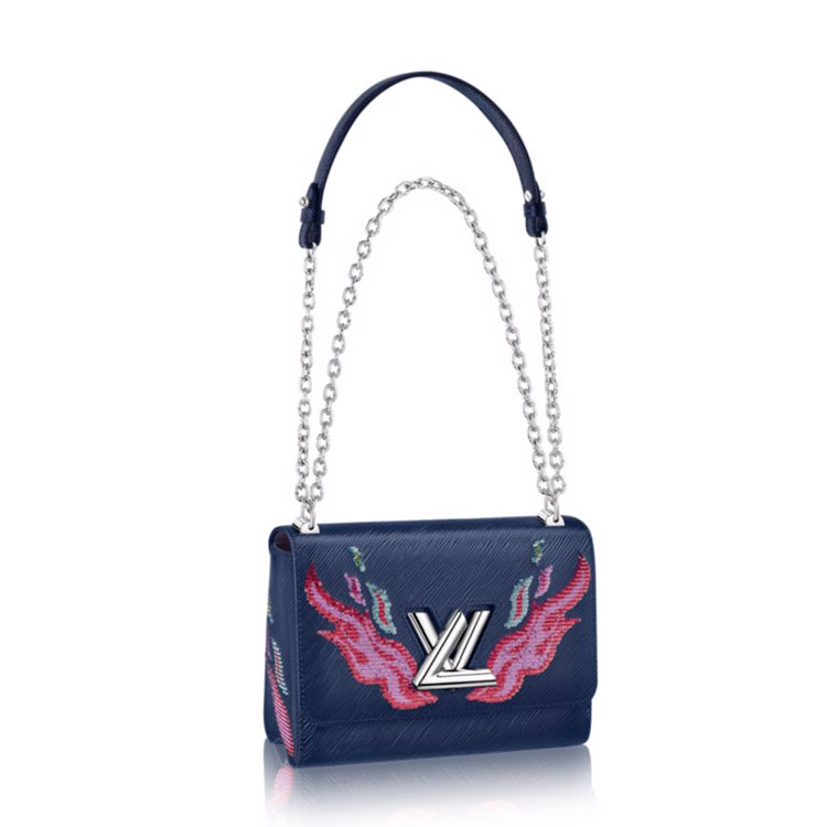 The perfect choice for a bold day-to-evening look, Louis Vuitton's New Classic Twist bag is given a rock touch with sequin-embroidered flames motifs on pearly Epi leather.