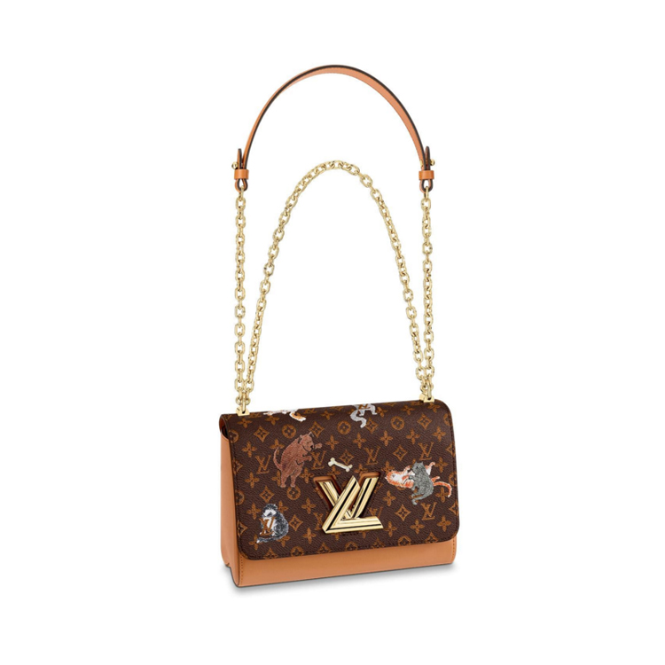 The Twist bag has never been so adorable: the “Catogram” theme, developed by Nicolas Ghesquière and stylist Grace Coddington for Cruise 2019, energizes Louis Vuitton’s classic Monogram canvas with cute, colorful dogs and cats. With its gilt chain shoulder strap and signature LV Twist lock, this is a fun, dressy bag for animal lovers.