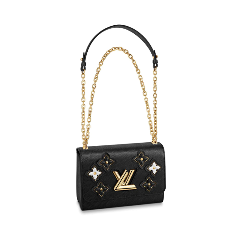 Louis Vuitton Couture鈥檚 Flower Tinsel theme comes to the Twist MM handbag for Spring-Summer 2019. The bag features Flowers made of studs and layered leather, reinterpreting the emblematic monogram pattern, and complementing nicely the black Epi leather: a subtle nod to the rivets found on Louis Vuitton鈥檚 iconic trunks.