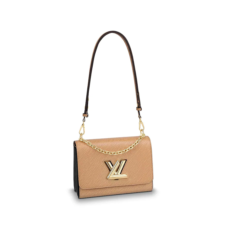This Twist MM handbag in Beige Tivoli Epi leather edged with black is a must-have for Summer 2018. Now established as the Louis Vuitton chain bag, the Twist is offered this season with a new leather strap, for more carry options. For day, it can be worn over the shoulder or cross-body. Held by the short chain handle (with the strap removed) the bag becomes an ideal accessory for evening looks.