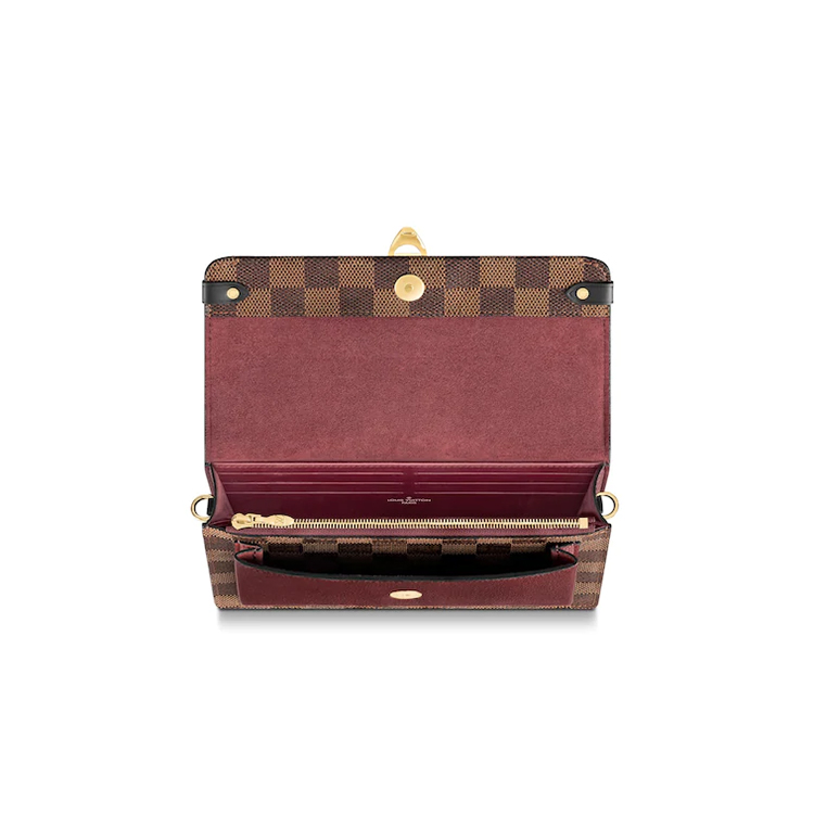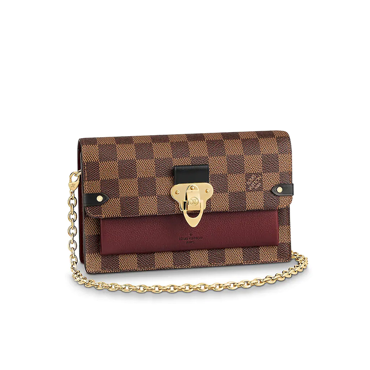 The Vavin chain wallet combines Louis Vuitton's iconic Damier canvas with colored leather in a smart design that works for day and evening. Its flap, secured with a clasp inspired by the historic trunks, conceals a front pocket which is ideal for a smartphone. Its removable chain enables it to be carried in several different ways.