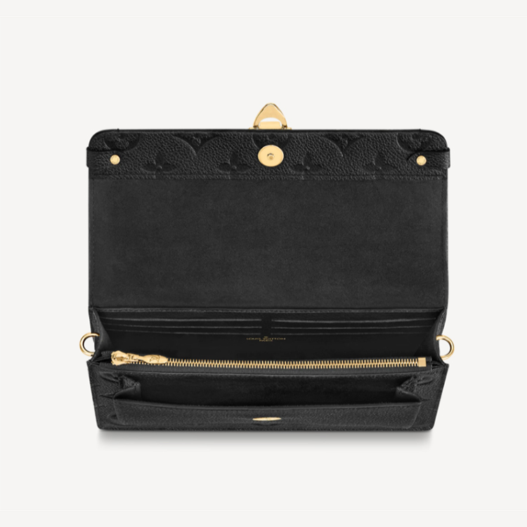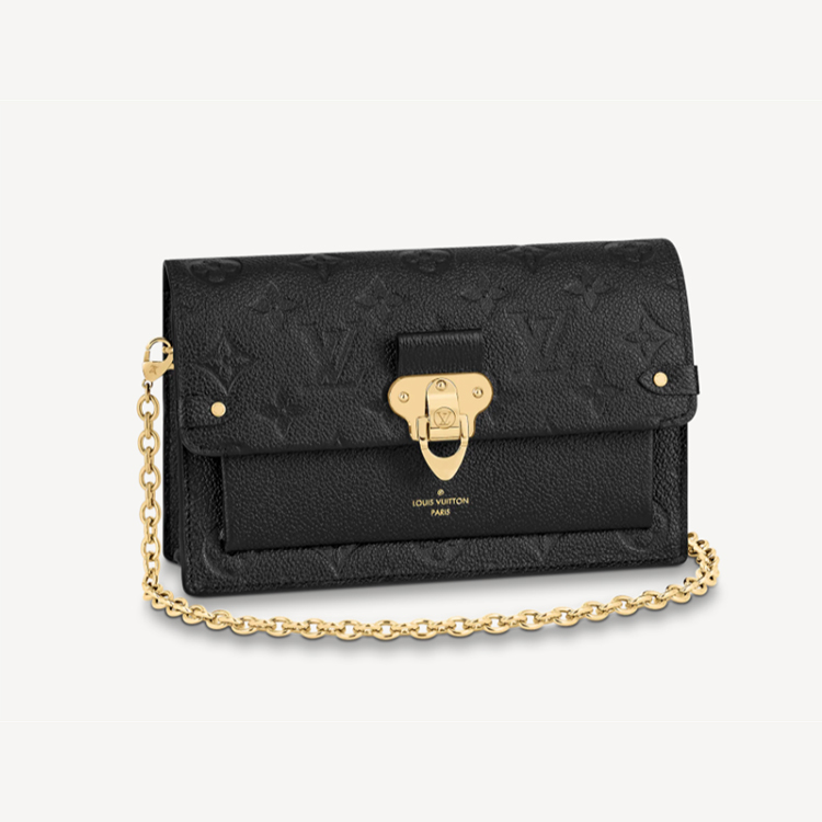 The Vavin Wallet on Chain is fashioned from Monogram Empreinte leather and finished with a gold-color lock inspired by Louis Vuitton trunks. This model in leather鈥檚 subtle tone-on-tone embossed print complements the wallet on chain classic lines perfectly. The front pocket, embossed with the Louis Vuitton signature, fits a phone, while inside pockets and compartments bring convenience.