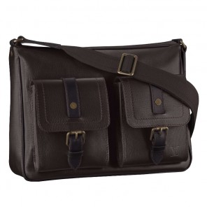 - Utah leather discreetly stamped with LV initials, rustic cotton lining, textile strap