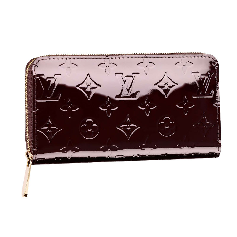 The wallet comes in Monogram Vernis leather and features a zipper closure. It holds up to eight credit cards with one compartment for small change and four others for bills and documents.