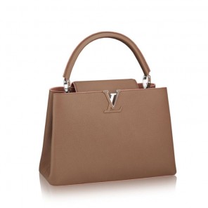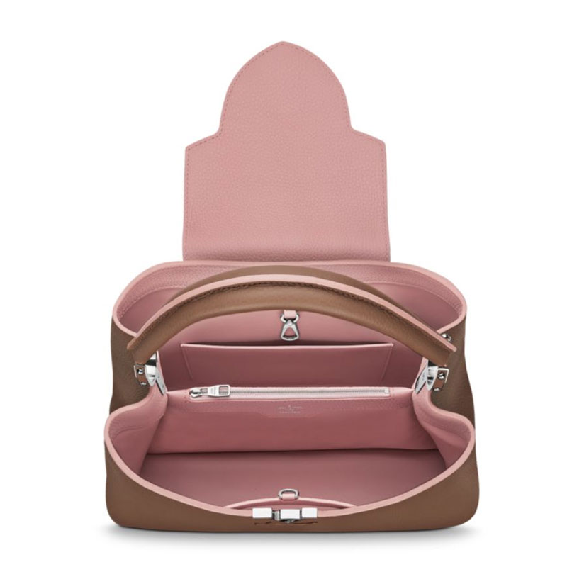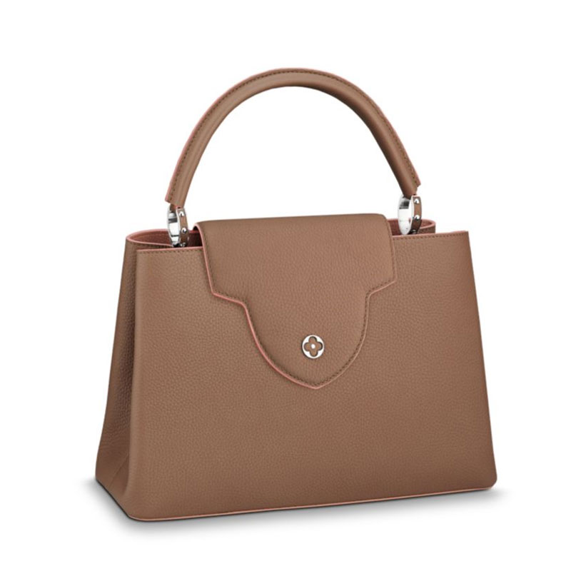 Taking its name from the rue des Capucines in Paris, where Louis Vuitton opened his first store in 1854, the timelessly elegant Capucines bag is a testament to fine leather craftsmanship. In full-grain Taurillon leather, it combines refined details, including a semi-rigid handle secured by jewel-like rings, with a spacious, functional shape offering two inside compartments. Its distinctive flap can be worn in two ways: outside to reveal the outline of a Monogram flower, or inside to show the LV initials.