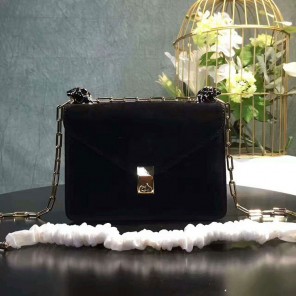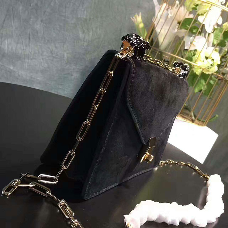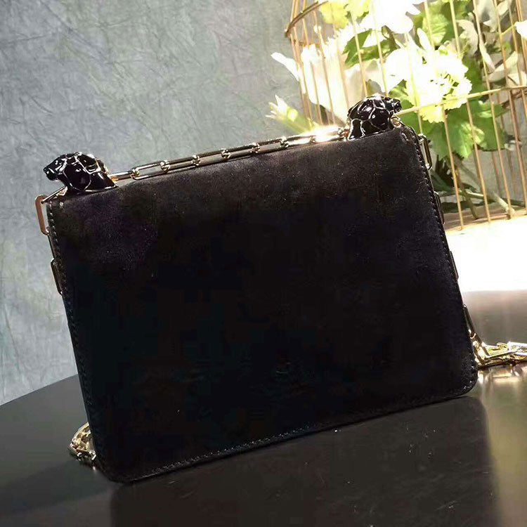 - The handbag is embellished with two panther heads in brass and enamel, through which the chain slides and can be adjusted.