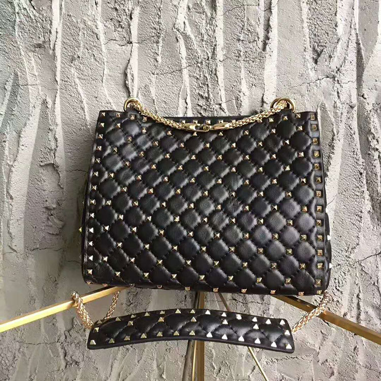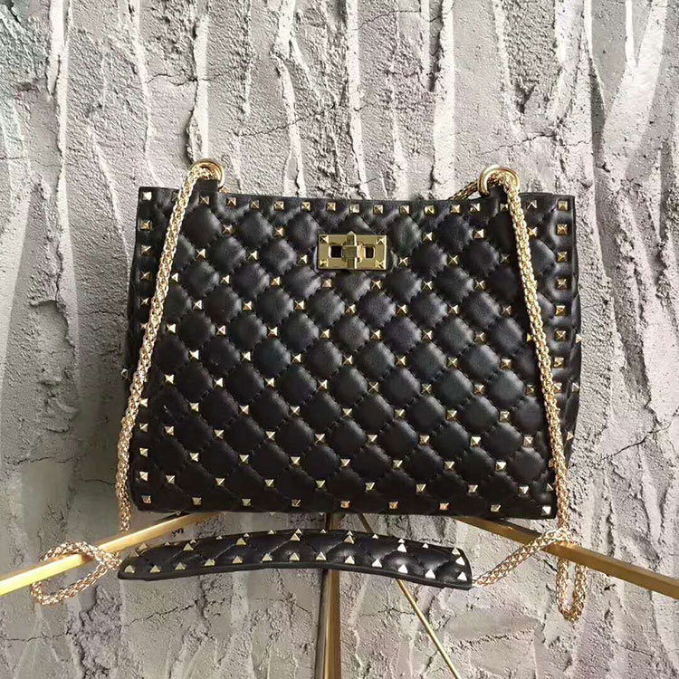Valentino Garavani Rockstud Spike MEDIUM tote bag in soft crackle lambskin leather. Quilted bag with micro stud detailing. The adjustable chain means the bag can be worn as a shoulder bag or as a cross body bag.