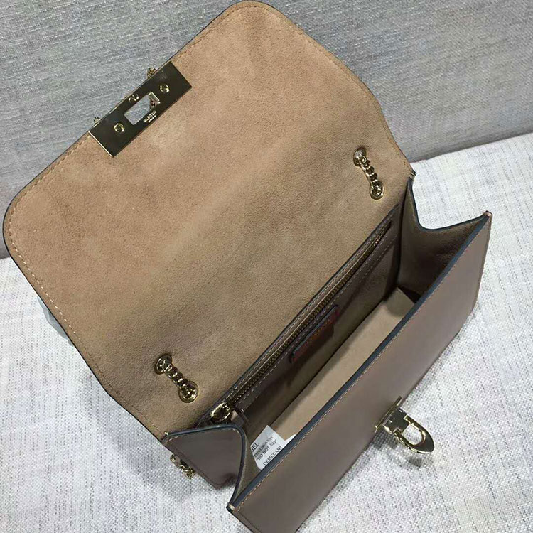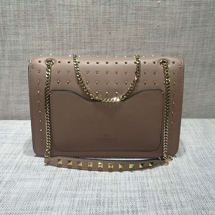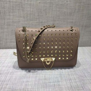 - Flip lock closure decorated by two maxi studs tied by a small decorative chain