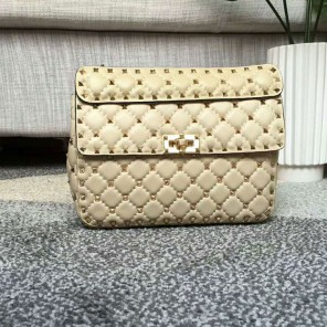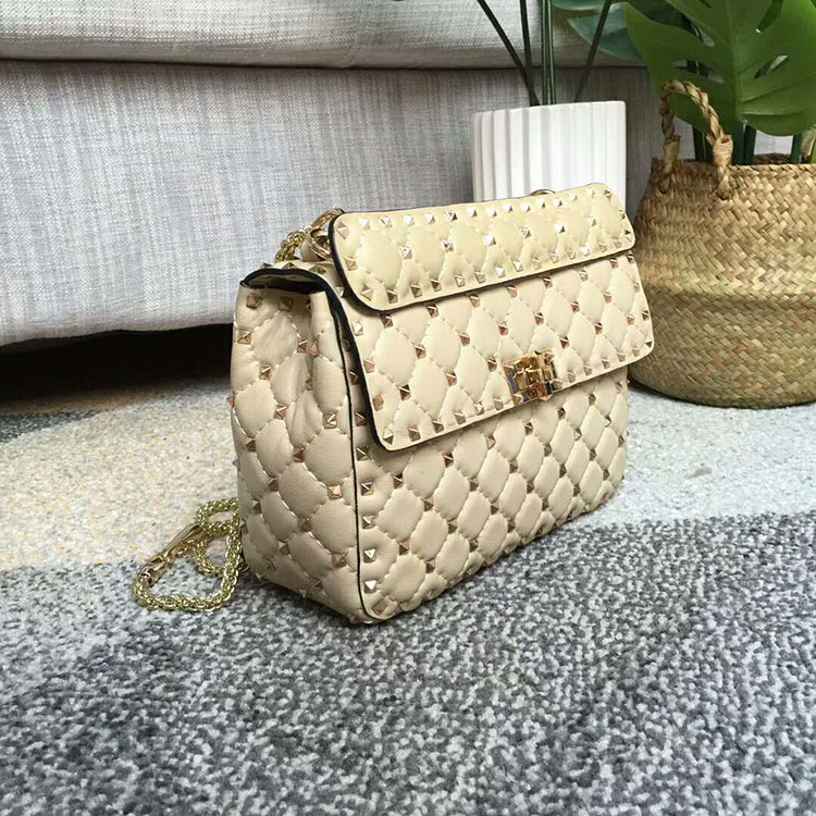 Valentino Garavani Rockstud Spike medium chain bag in Lambskin. Quilted bag with micro stud detailing. The detachable top handle and the adjustable, detachable chain strap mean the bag can be worn as a shoulder bag, a cross body bag, or carried by hand.
