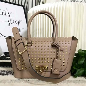 The new Valentino Garavani Demilune is an example of fine leather craftsmanship combining a smooth and elegant design with new and exclusive detailing. Double handle bag in soft full grain calfskin leather with a natural hand and shiny finishing. Tubular handles. The strap, adorned with studs in different sizes, is adjustable and removable.